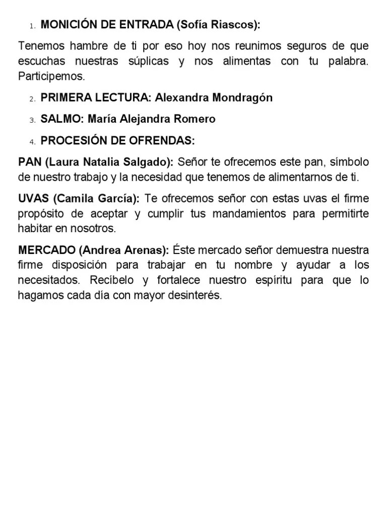 Ofrendas para la misa de navidad · las luces. Guion misa accion de gracias (cumpleaños) con gestos. Señor te ofrecemos el pan y vino, signo de entrega y comunión fraterna. Moniciones y presentación de ofrendas misa de acción de gracias diácono cristian c. Se hace la presentación del pan y del vino por parte del religioso que oficia la misa, haciéndoles un llamado implícito a los fieles devotos a . Vino recibe padre esta ofrenda, recordando asi la sangre de tu sacrificio.